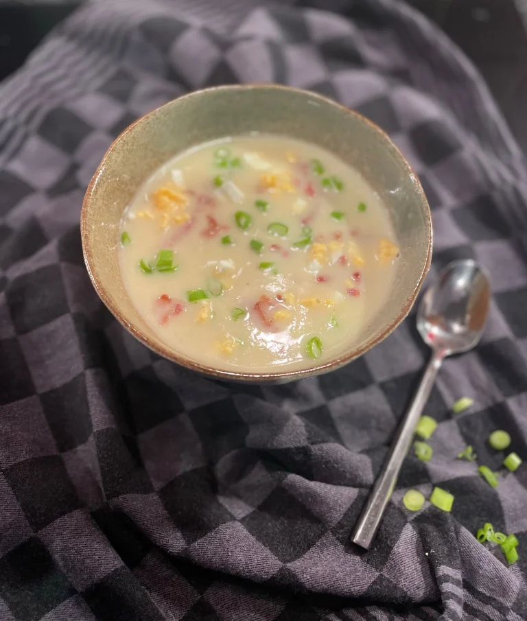 Serveer de gebonden aspergesoep met ringetjes lente-ui en gebakken spekjes.
