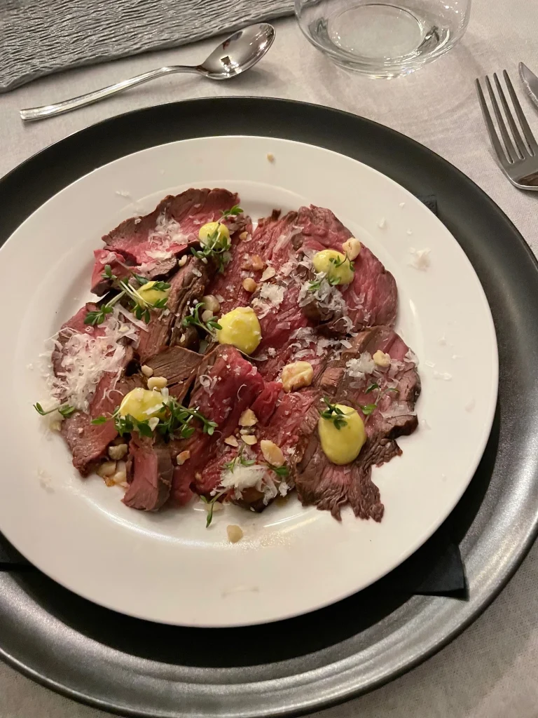 Steek de thermo pen in een steak en Grill de steaks naar een kerntemperatuur, van 45 graden. Ja, ze mogen best een beetje rood zijn omdat je ze heel dun gaat snijden. Houd je niet zo van rood, laat ze dan wat langer liggen tot ze voor jou de juiste kerntemperatuur hebben. Zijn de steaks klaar haal ze van de grill en leg ze op je snijplank. Dek ze losjes af met aluminiumfolie en laat de steaks 10 minuten rusten. Snijd het vlees in zo dun mogelijke plakjes. Ik heb deze carpaccio gesneden op een snijmachine, maar met een goed scherp mes is het ook prima te doen. Je serveert het gerecht koud, dus neem je tijd!