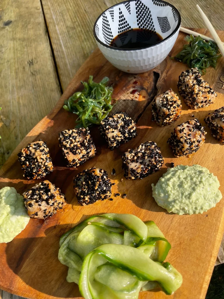 Snijd de tonijn met sesamjasje in plakjes en leg mooi op een bord. Serveer met de komkommerlinten en toefjes avocado creme.